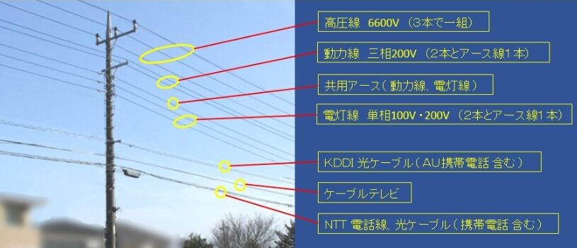 基地局に辿りついたデータは、光ファイバーと呼ばれるケーブルを通り(例:下図のような電線の下の3本線)、回線業者(キャリア)の本拠地へと旅をする。